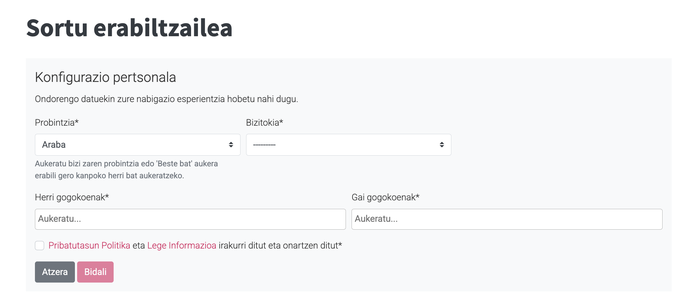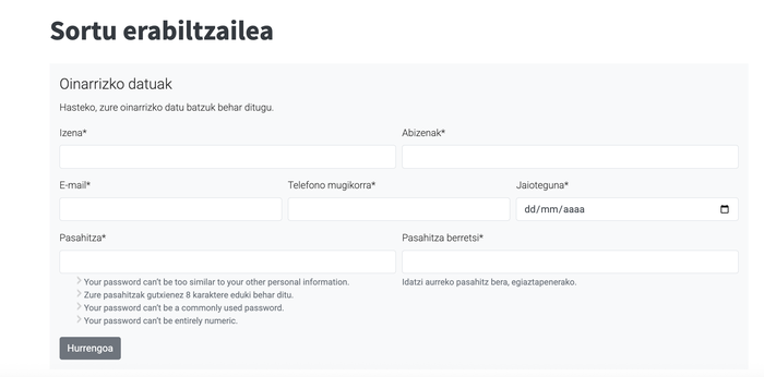 2. Zure erabiltzaile profila sortu, eta formularioan ageri diren datu guztiak bete. Ondoren, 'hurrengoa' botoia sakatu.